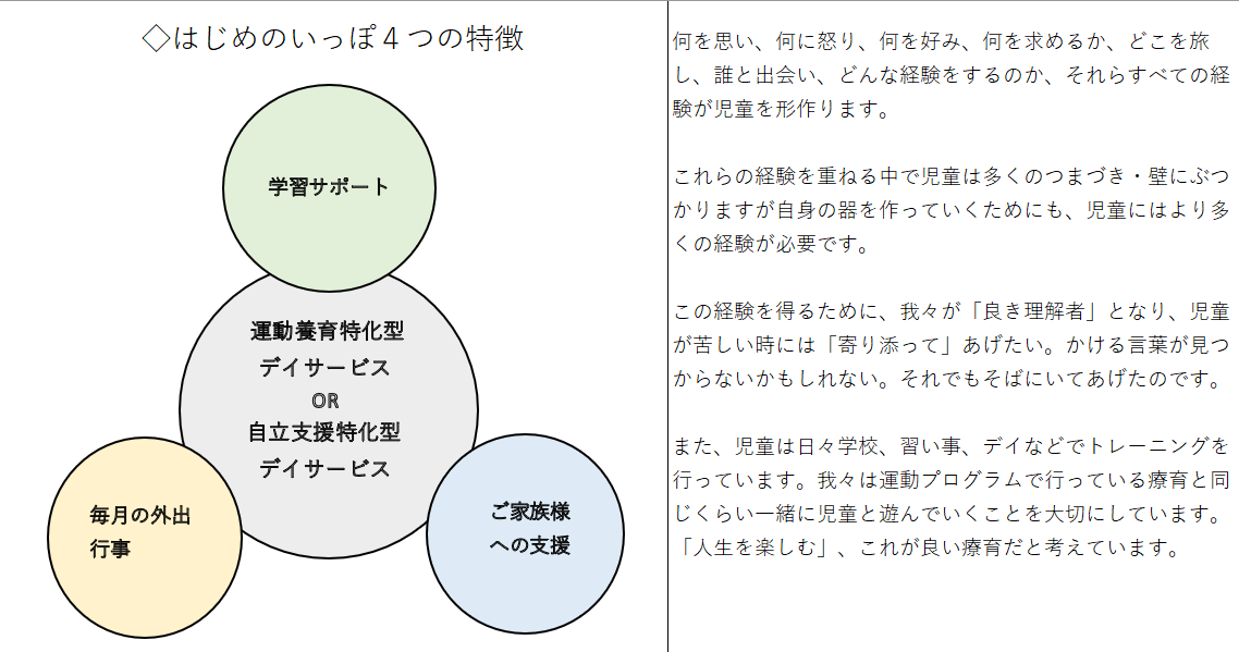 ※学習のサポートやレクリエーションももちろん行っており、運動、遊び、勉強をバランスよくすることが最も発達の助けになると考えています。