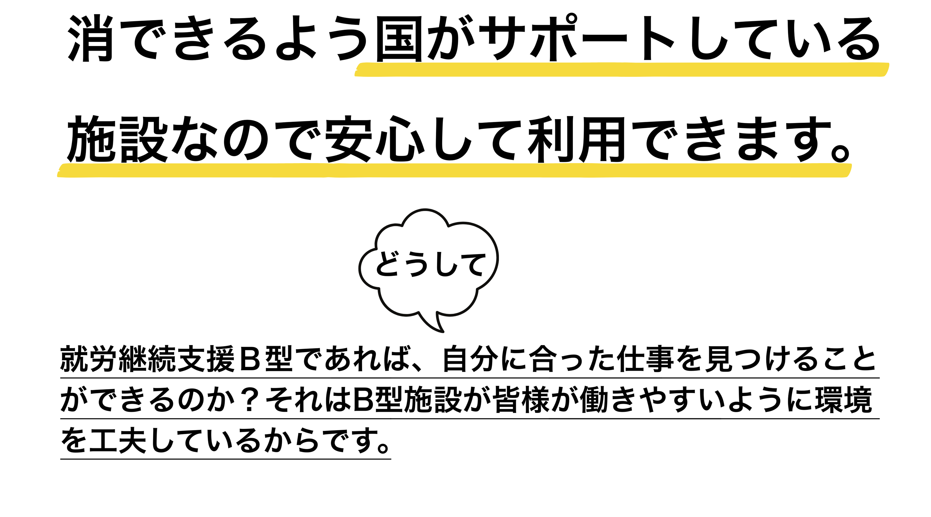 私たちは皆様の就労継続支援B型でのお仕事の一歩を踏み出せるように応援させていただきます。