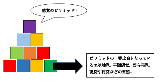 基礎となる感覚をしっかりさせる(統合させる)ことで、上位にあるより複雑な機能を築きながら、運動や学習の力が積みあがっていきます。
