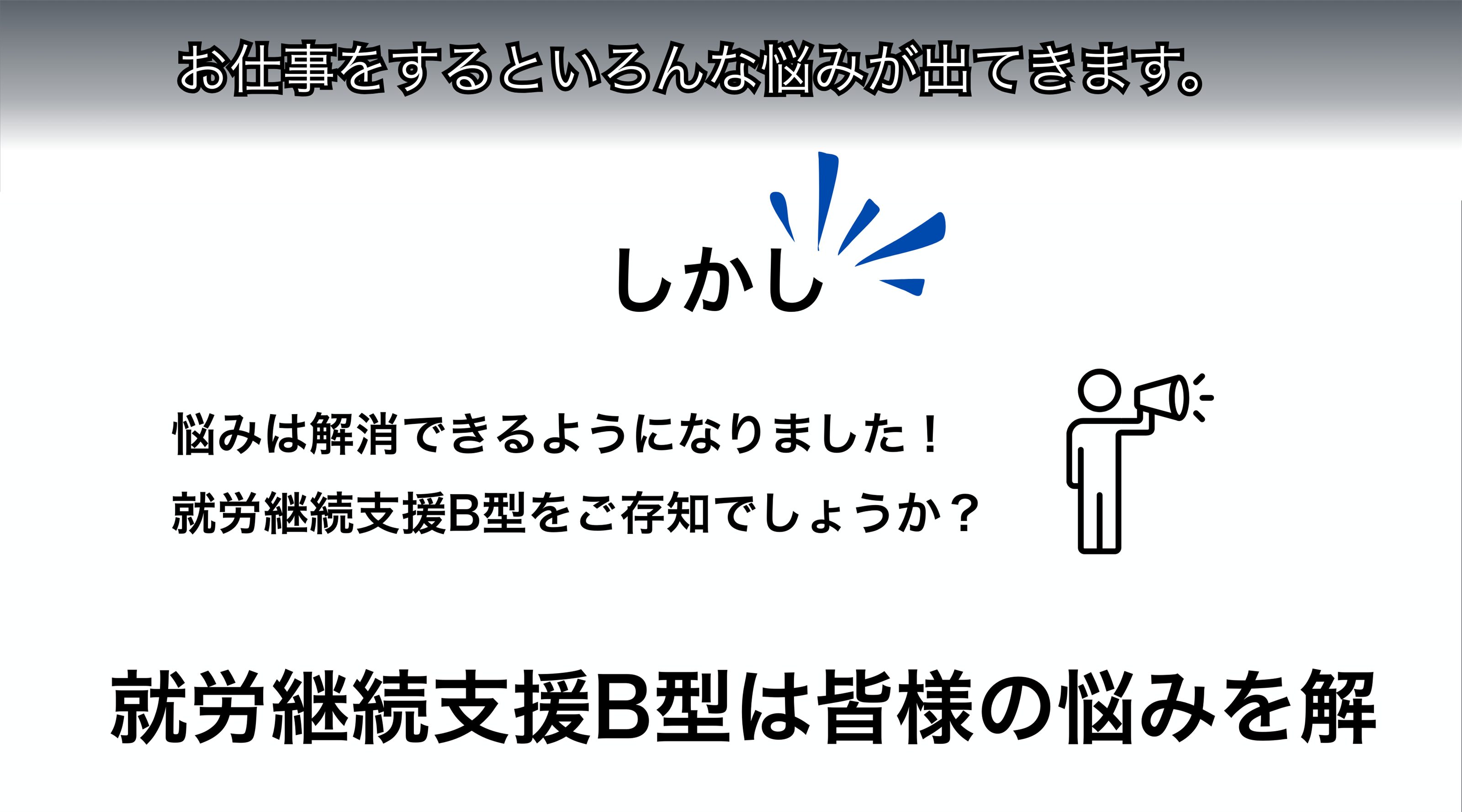 私たちは皆様の就労継続支援B型でのお仕事の一歩を踏み出せるように応援させていただきます。