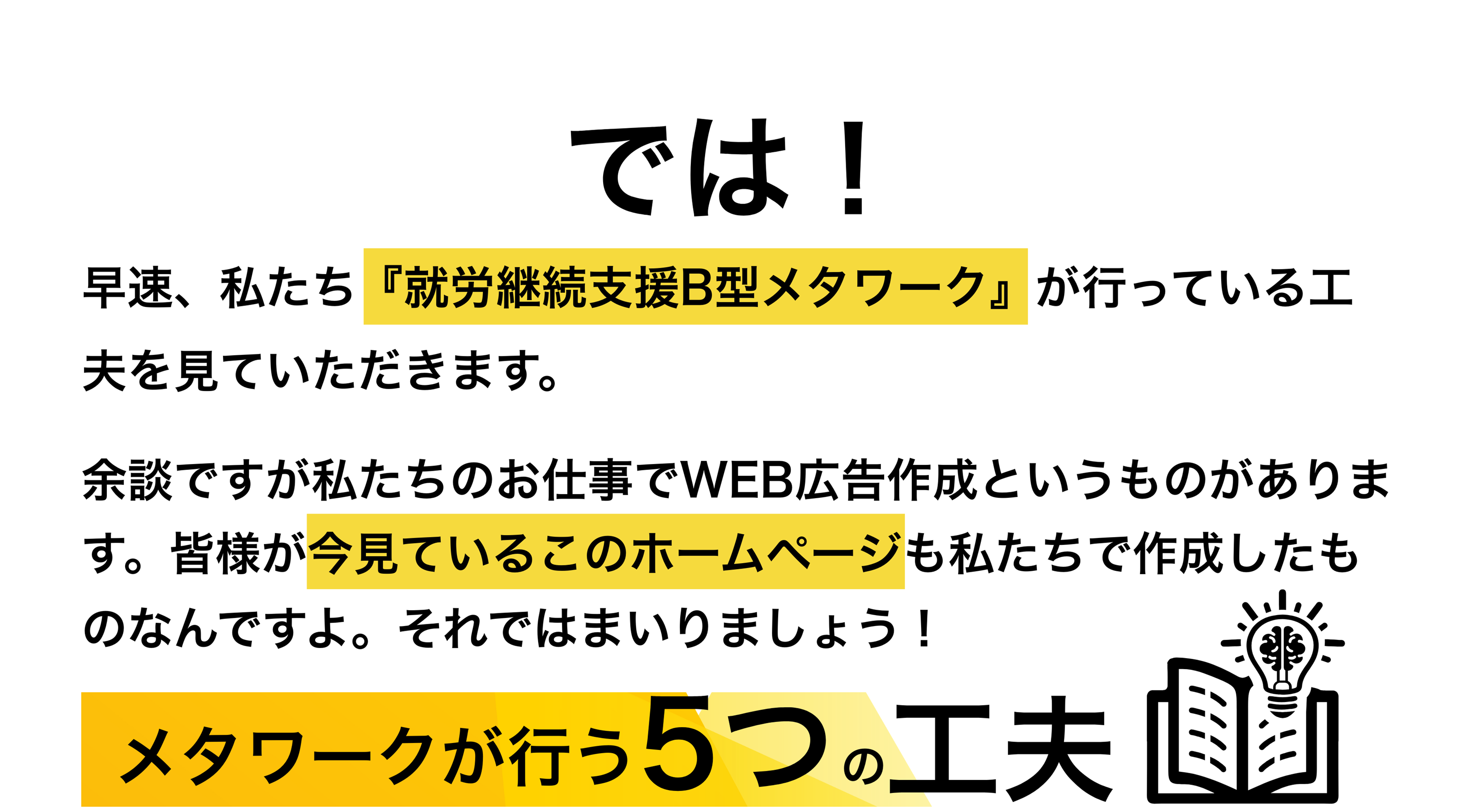 このように思われている方はとても多いように思います。メタワークでは下記取り組みから始めています。ご安心ください。