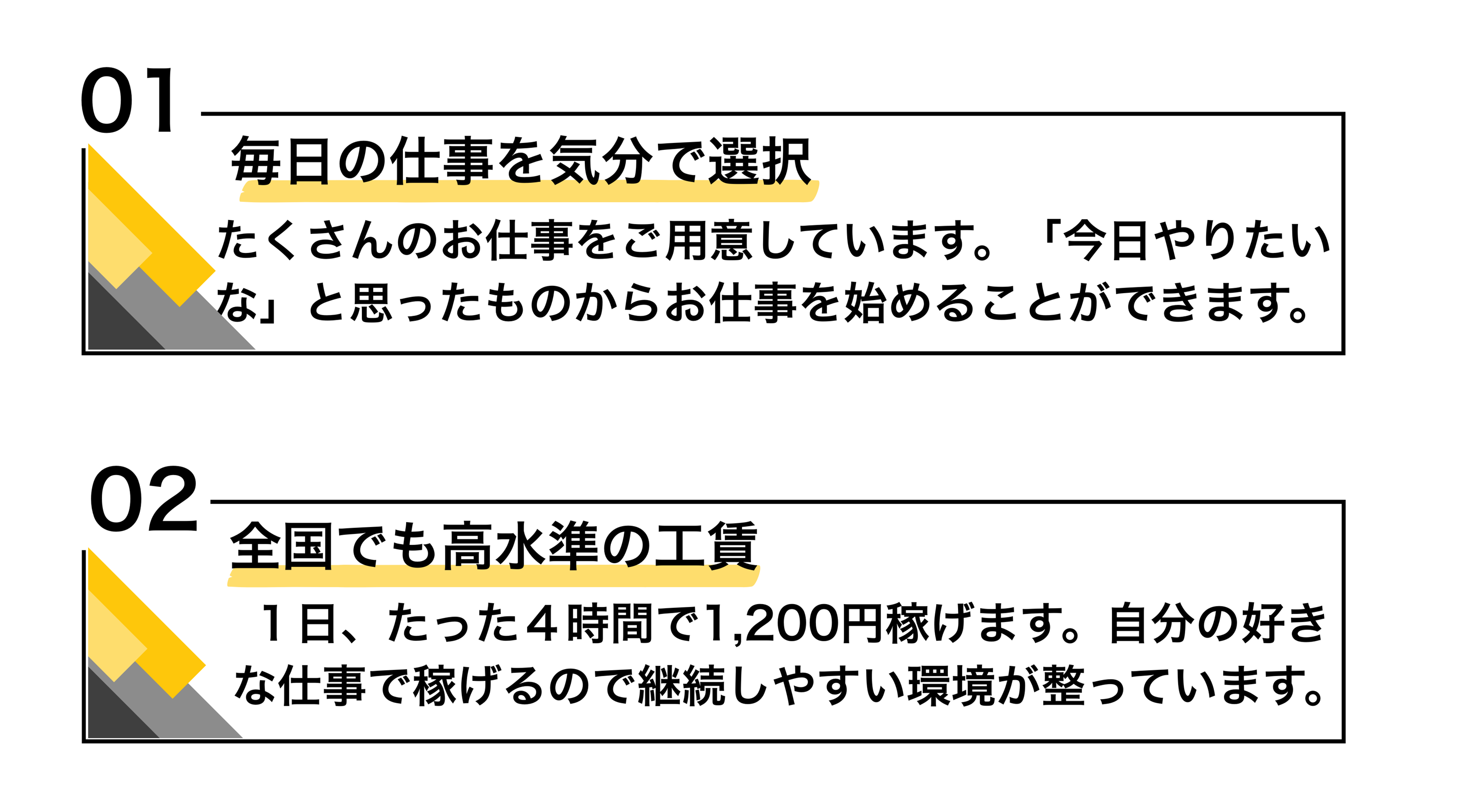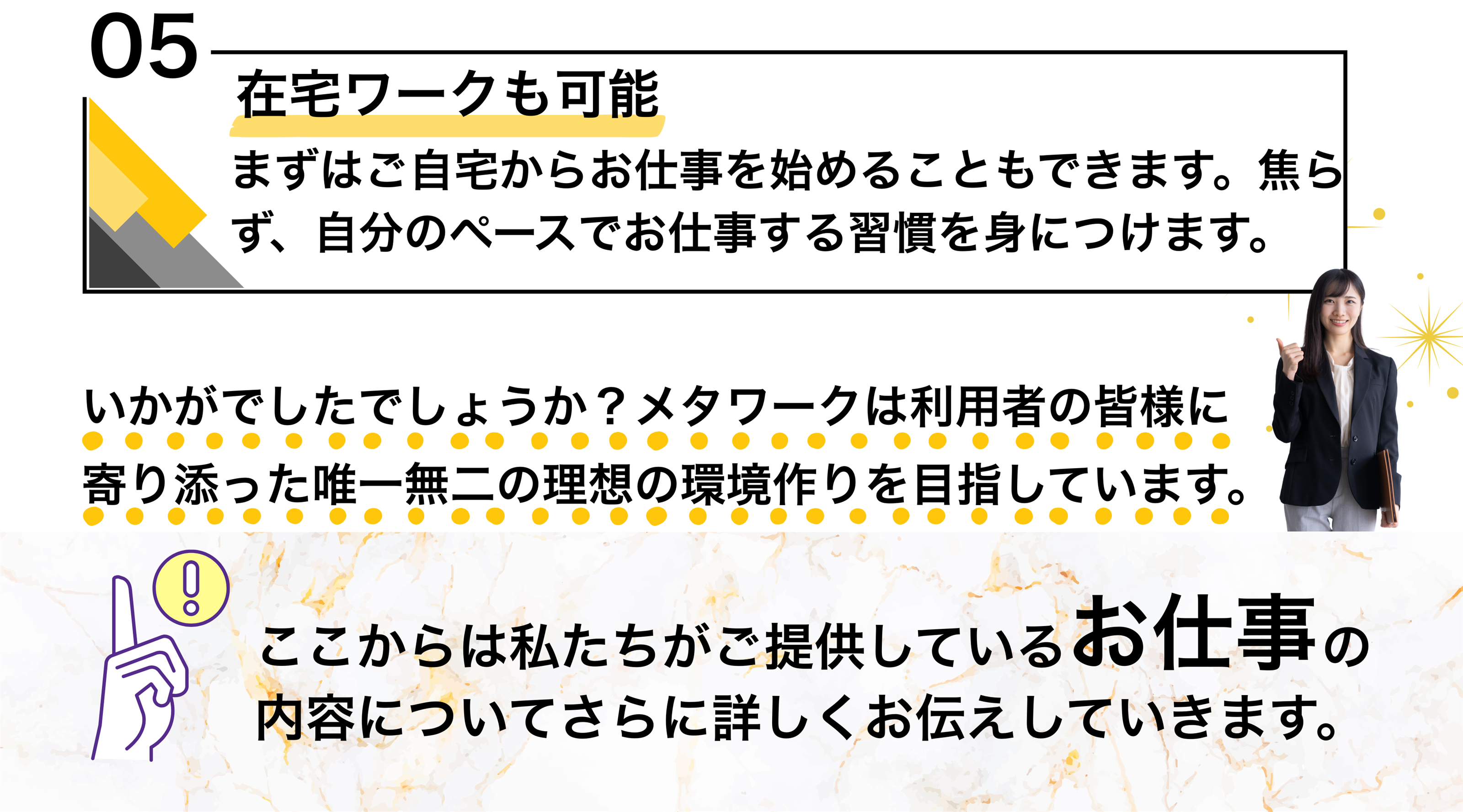 また内職などの軽作業のお仕事、eスポーツやメルカリ販売などもご提供しており、どんな方にでも対応できるようにお仕事を準備しています。